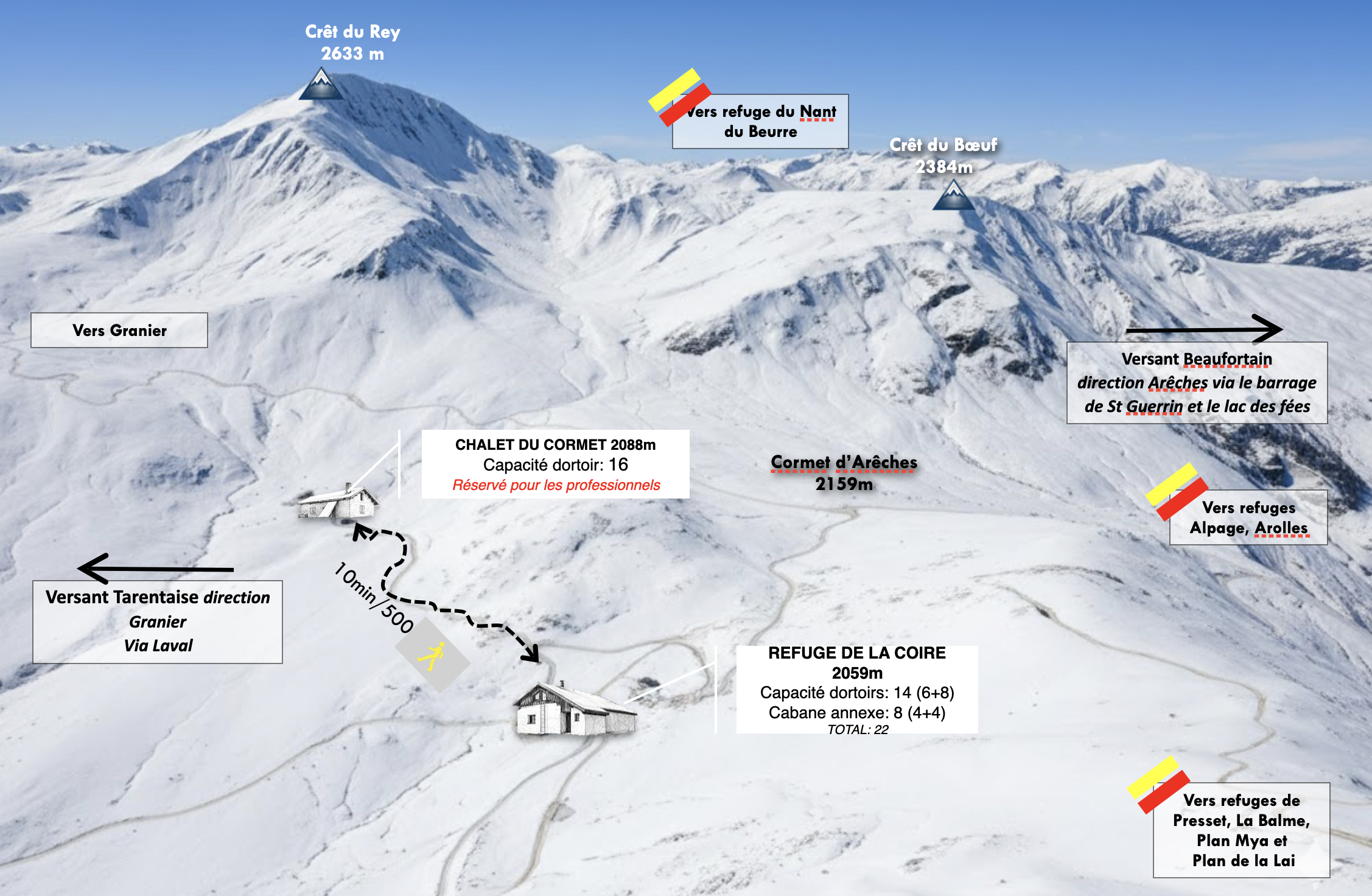ATTENTION : L’hiver, le refuge est gardé de mi-mars à fin avril. Nous montons également en dehors de cette période sur demande et à partir de 10 réservations si les conditions météorologiques le permettent.